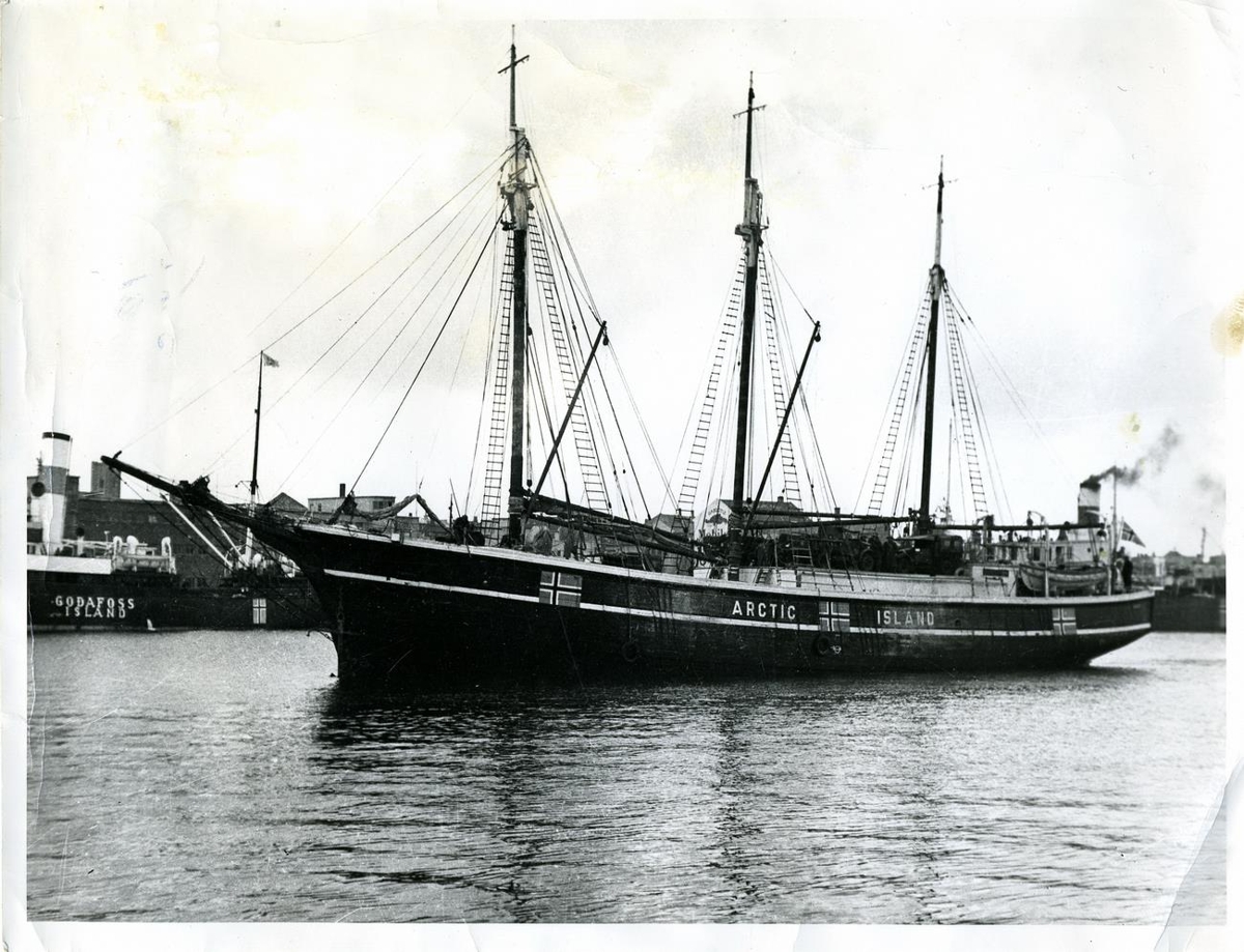 Þrímastra seglskipið Arcti í Reykjavíkurhöfn. Íslenski fáninnn málaður á hliðar þess auk landheitisins Island og á dekkinu má sjá tvo hertrukka af Dodge Weapon gerð. í bakgrunni sér í e/s Goðafoss við bryggju. Á bakhlið er stimpill ljósmyndara: Ljósmyndastofa / S. E. Vignir / Samtún 40. „Fiskimálanefnd keypti seglskipið Arctic árið 1939 og var það eitt af þremur seglskipum sem var í förum milli Íslands og annarra landa fram til 1943. Arctic var smíðað i Sviþjóð 1919 og var jafnframt vélknúið. Það var frystiskip og notað til að flytja frystan fisk. strandaði við Snæfellsnes og eyðilagðist. (Sjá bókina Skipstjórar og skip, er ekki með ekki blaðsiðutal)“ (ÁÓG 2015)
