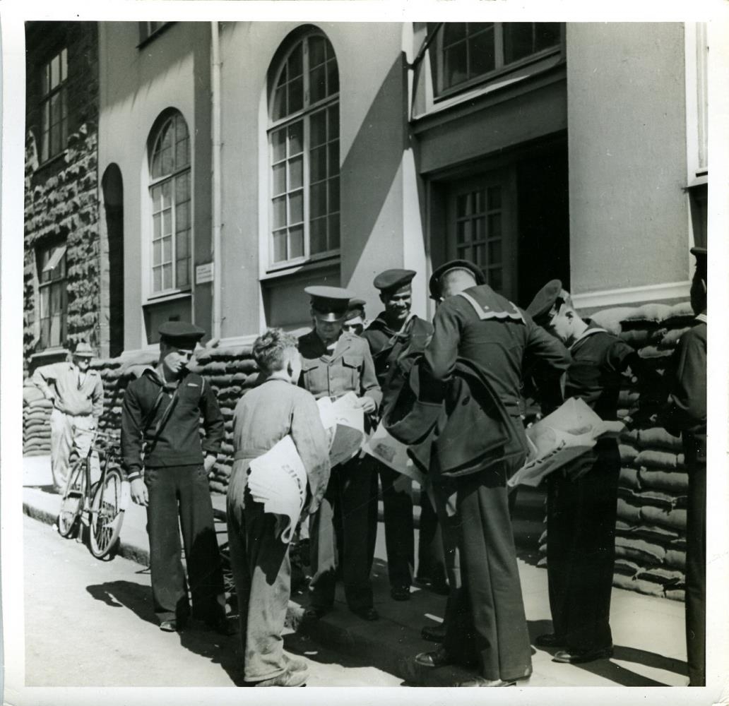 Hermenn kaupa dagblöð af blaðasala við Póststofuna í Pósthússtræti. Á bakhlið er skrifað: Amerískir sjóliðar kaupa ísl. blöð 1. daginn er þeir ganga á land. 11. mynd, þessi stærð. Stimpill ljósmyndara: Svavar Hjaltested Reykjavík.