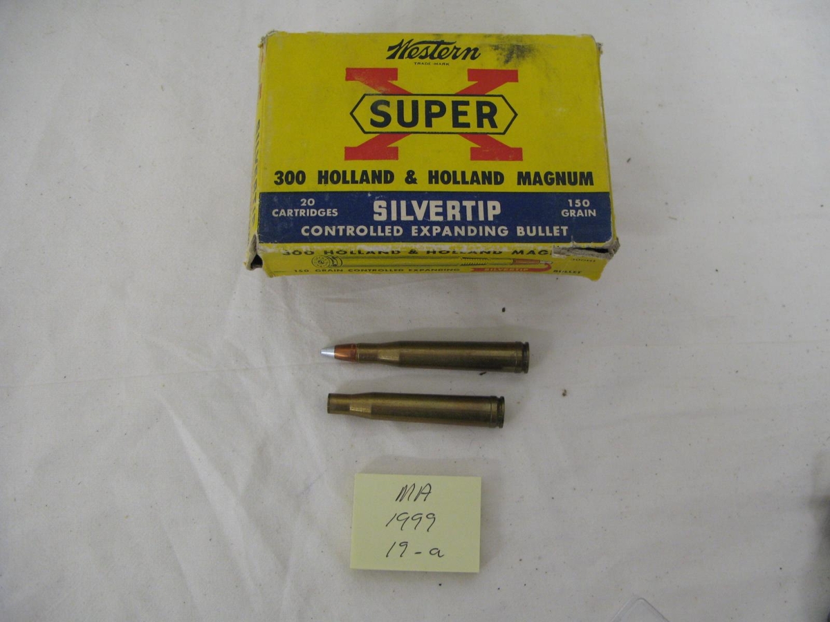Tuttugu skota pakki, gulur, með einni patrónu og einu skoti. Teg. Westen Super X Silvertip. 180 greina 300 Holland og Holland caliber. Axel fer fyrst á hreindýraveiðar 1963. Skotin eru keypt upp úr því af Þorsteini Thorarensen fv. bæjarfógeta, Reykjavík.