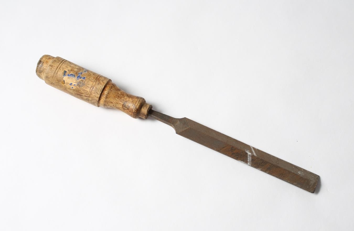 Þjöl með renndu skafti. Þjölin er með hallandi hliðum í hvora átt. Kom úr búi Vigfúsar Sigurðssonar.