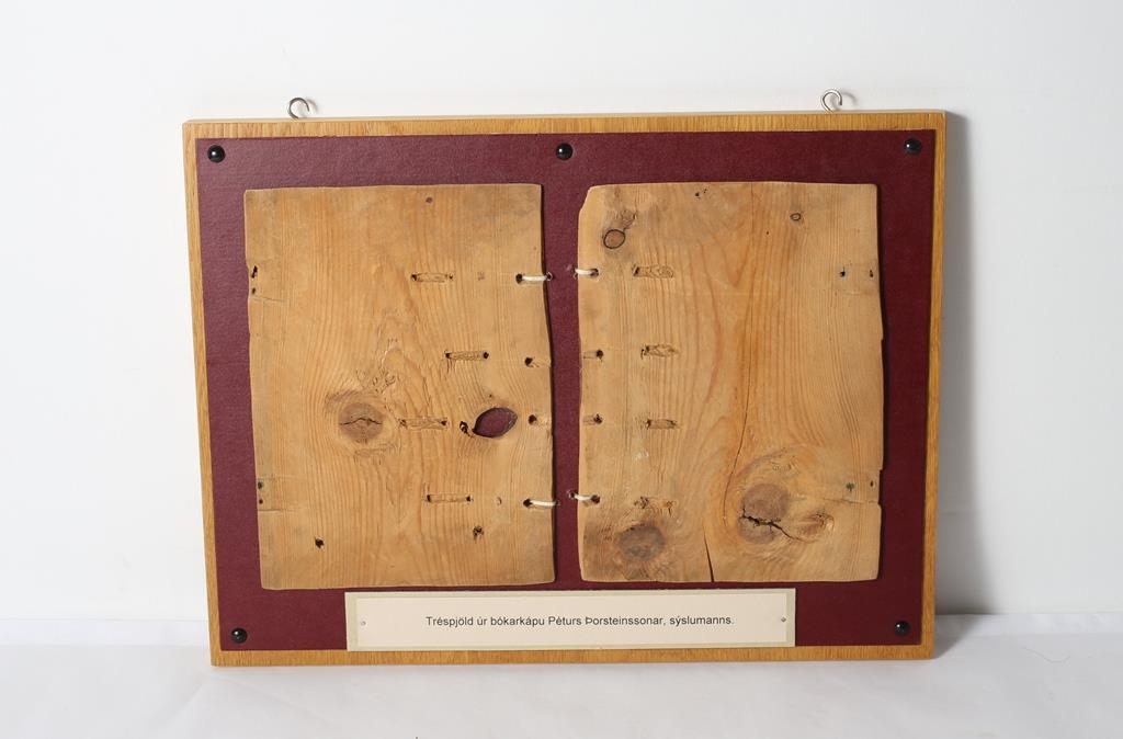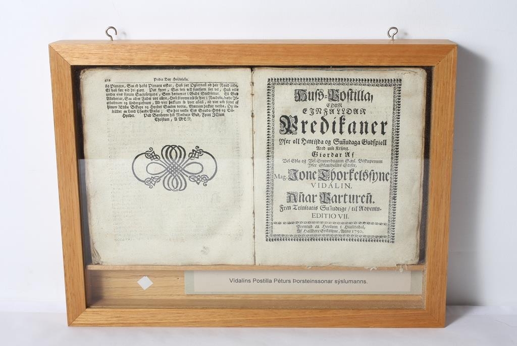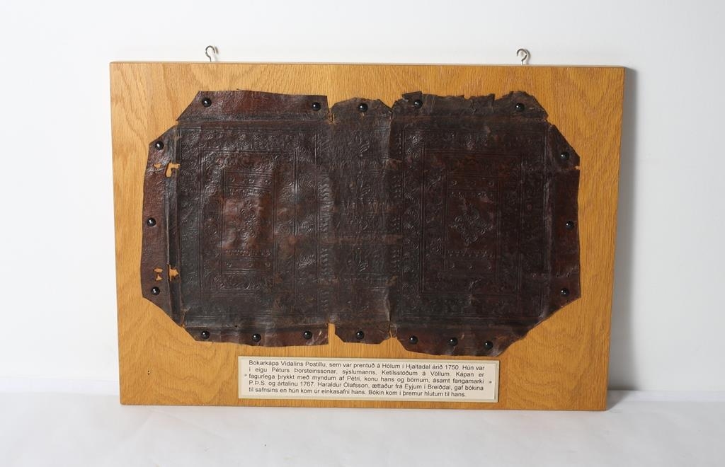 Vídalínspostilla. Prentuð á Hólum í Hjaltadal árið 1750. Bókin mun vera úr eigu Péturs Þorsteinssonar, sýslumanns á Ketilsstöðum á Völlum. Leðurkápa er fagurlega þrykkt með myndum af konu og börnum Péturs Þorsteinssonar, sýslumanns, fangamarki hans og ártali: "P.Þ.S.1767". Utan um bókina eru tréspjöld.