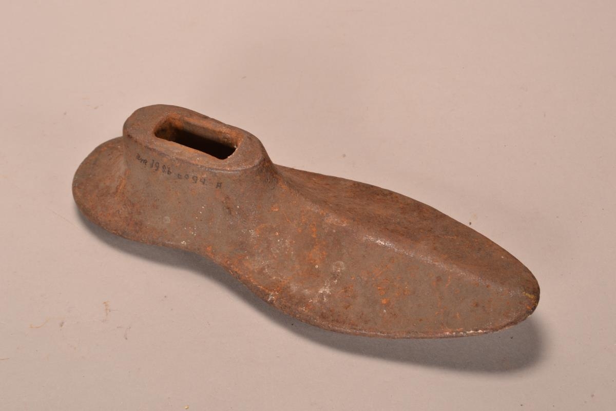 Leistur úr málmi. Skórinn var þræddur upp á leistinn til að halda honum föstum þegar verið var að sóla skóinn.