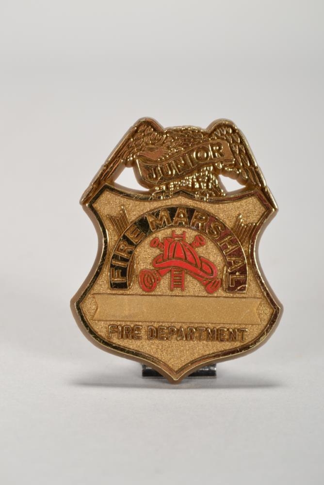 Plastmerki sem á stendur „Fire Marshal Junior...“