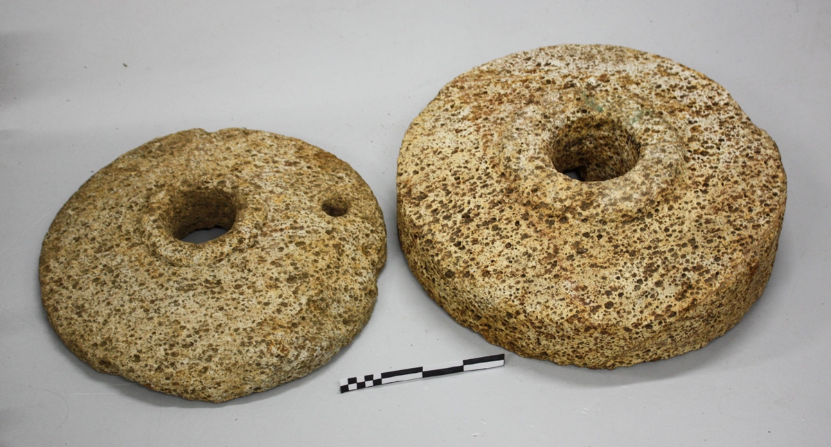 Tveir samstæðir steinar úr ljósu grjóti, göt eru í þeim. Frá Surtsstöðum. Vigt 14,3 g og 37,5 g.