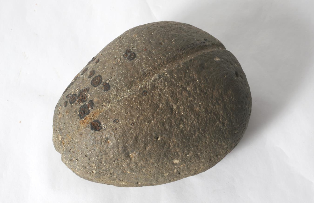 Hurðarlóð. Nærri kringlóttur steinn með rauf eða skoru, karkaðri allan hringinn í kringum steininn.. Fundið á Barkarstaða (Bakkastaða) rústum, norðan Grímsstaða á Fjöllum, 11. sept. 1990 af Páli Pálssyni, Aðalbóli.