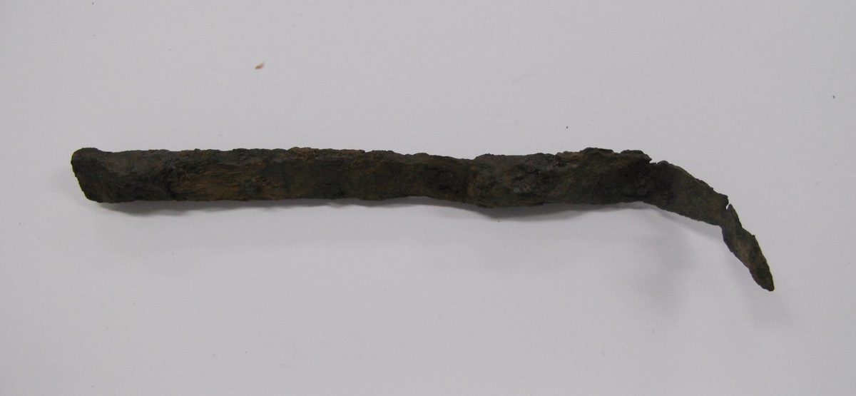 Ryðgað hnífsblað með örlitlum viðarleifum. Páll Pálson, finnandi, telur að þetta sé einn af mununum sem fundnir eru á Barkarstöðum í Grímsstaðalandi á Fjöllum.