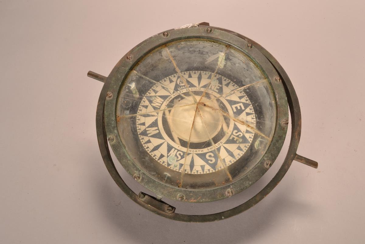 Kompás úr Mb. Svan KE 6. Tekin úr bátnum á strandstað. Seguláttaviti á fjórum jafnvægisásum. Áttavitarós er fljótandi í spíra í lokuðu húsi með glerloki, efni í húsinu er kopar. Framleiðandi: „JOHN LILLEY X OLLIE L.T.D“