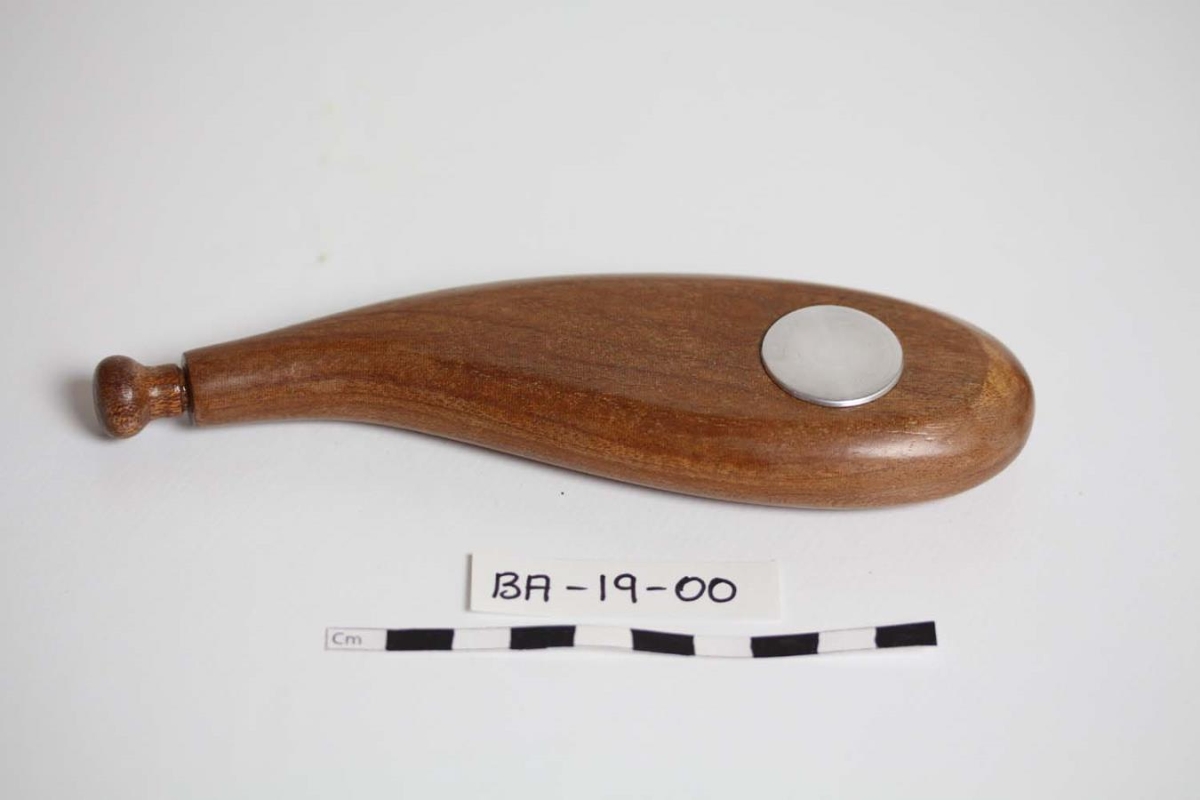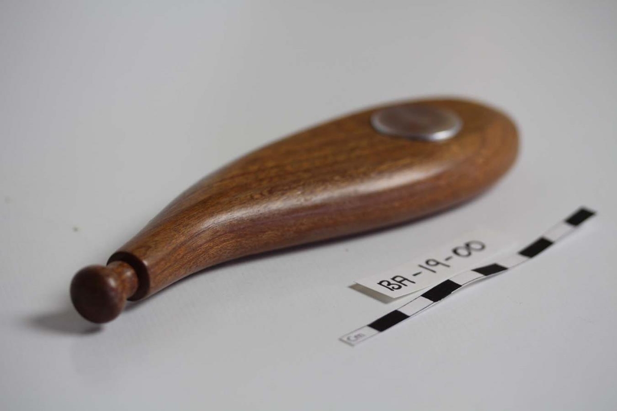 Lakkaður viður með tappa sem stunginn er niður í gatið. Málmhringur er á dósinni.