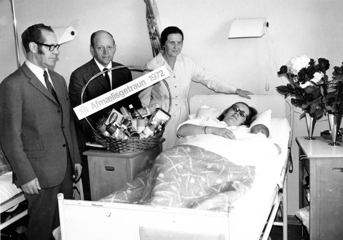 KEA menn afhenda SÍS verðlaun á fæðingardeildinni. Verðlaunahafi Guðný Sigurhansdóttir og barn.