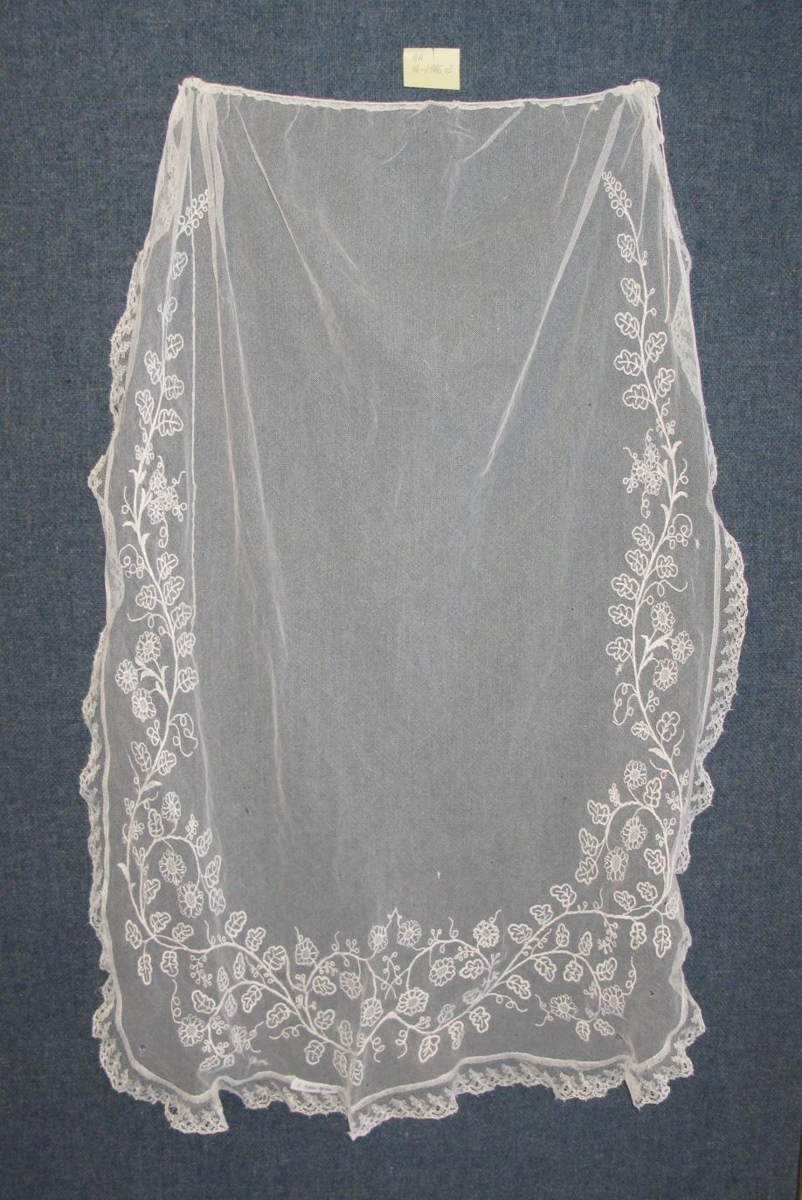 Hvítt fíngert, hálfgegnsætt með ísaumuðu munstri nálægt brúnum. Sigríður Guðbjörg Anna Sigmundsdóttir frá Ljótsstöðum á Höfðaströnd (f. 9.10.1862 d.16.7.1922) átti. Sigríður giftist Guttormi Vigfússyni sem var fyrsti skólastjóri Búnaðarskólans á Eiðum, síðar bóndi á Strönd í Vallahreppi og síðan í Geitagerði í Fljótsdal.