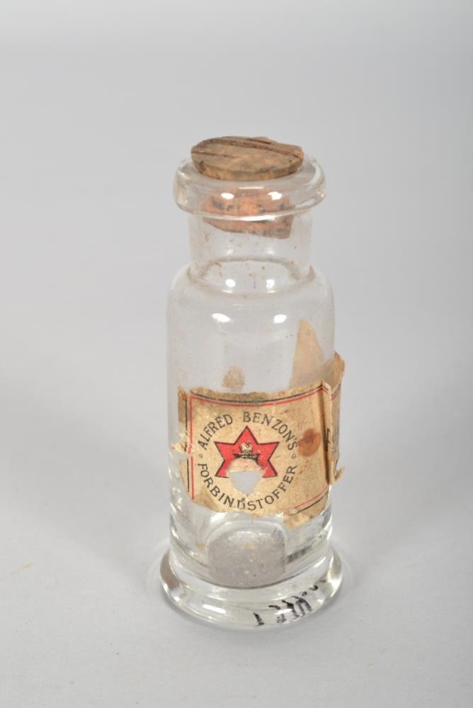 Lyfjaglas ú glæru gleri með korktappa; hluti af 22 læknisáhöld í kassa frá Þorgrími Þórðarsyni, lækni