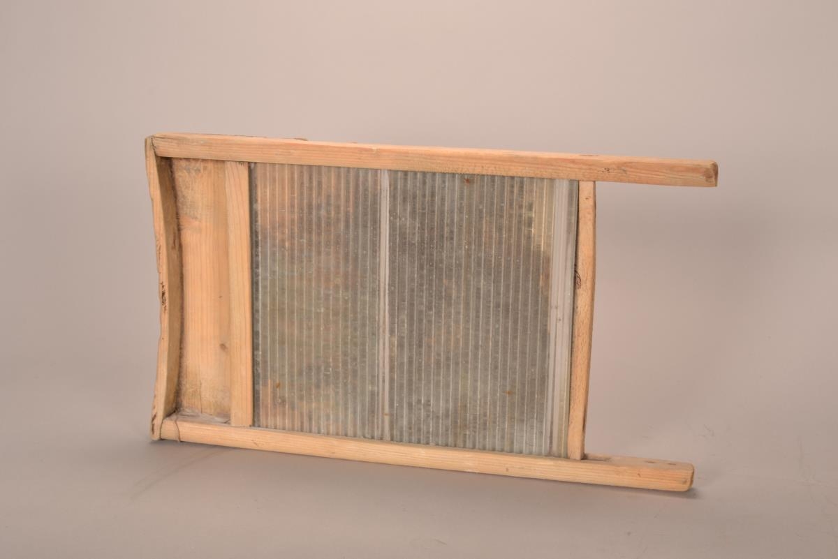 Bretti úr tré með bylgjulaga yfirborði úr gleri, notað til að nudda tau á við þvott