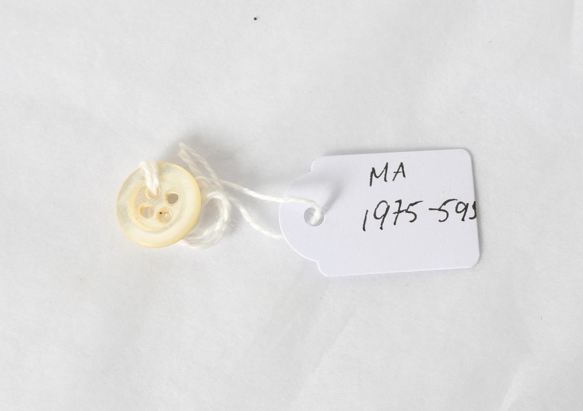 Hvítur skyrtuhnappur með fjórum götum. Fylgir hringprjónavél, MA-1975/388 úr búi Kristrúnar Hallgrímsdóttur, móður gefanda.