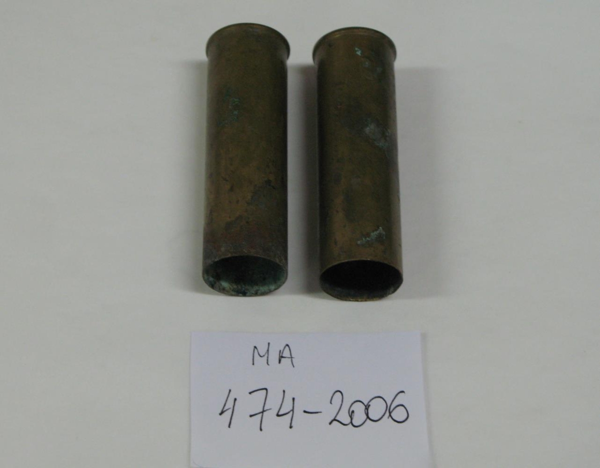 Fimm patrónur úr messing sem eru notaðar. Patrónur eru lítil hylki sem áður voru full af höglum og púðri, nú tóm.