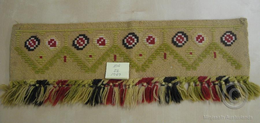 Hornhilluborði í gulu grænu, brúnu og ljósu. Breidd með kögri 20 cm. Stykkið er fóðrað á röngunni en fóðrið orðið slitið. Jarþrúður Einarsdóttir saumaði en Þórey Brynjólfsdóttir átti hann.