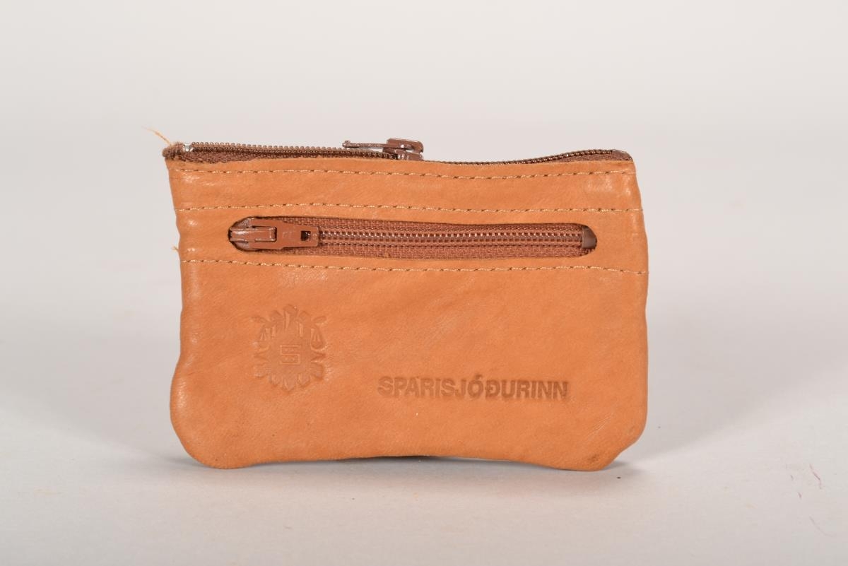 Brún leðurbudda fyrir lykla og smámynt merkt „Sparisjóðurinn“