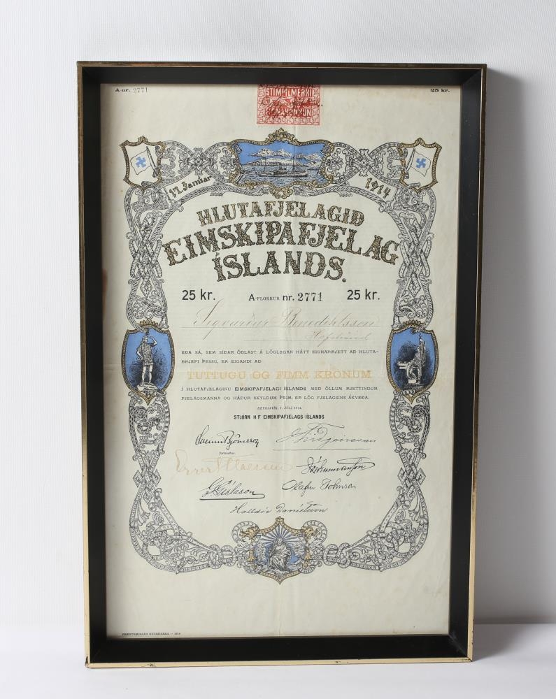 Innrammað hlutabréf frá Eimskipafjélagi Íslands að upphæð kr. 25. A-flokkur nr. 2771. á nafn Sigvarðar Benediktssonar Hofströnd. Bréfið er dagsett 1. júlí 1914. Sigmar Ingason erfði bréfið eftir fósturföður sinn, Sigvarða Benediktsson, og gaf safninu þegar þetta var fallið úr gildi og önnur "ósköp ómerkileg komu í staðinn" eins og segir í gjafabréfinu.