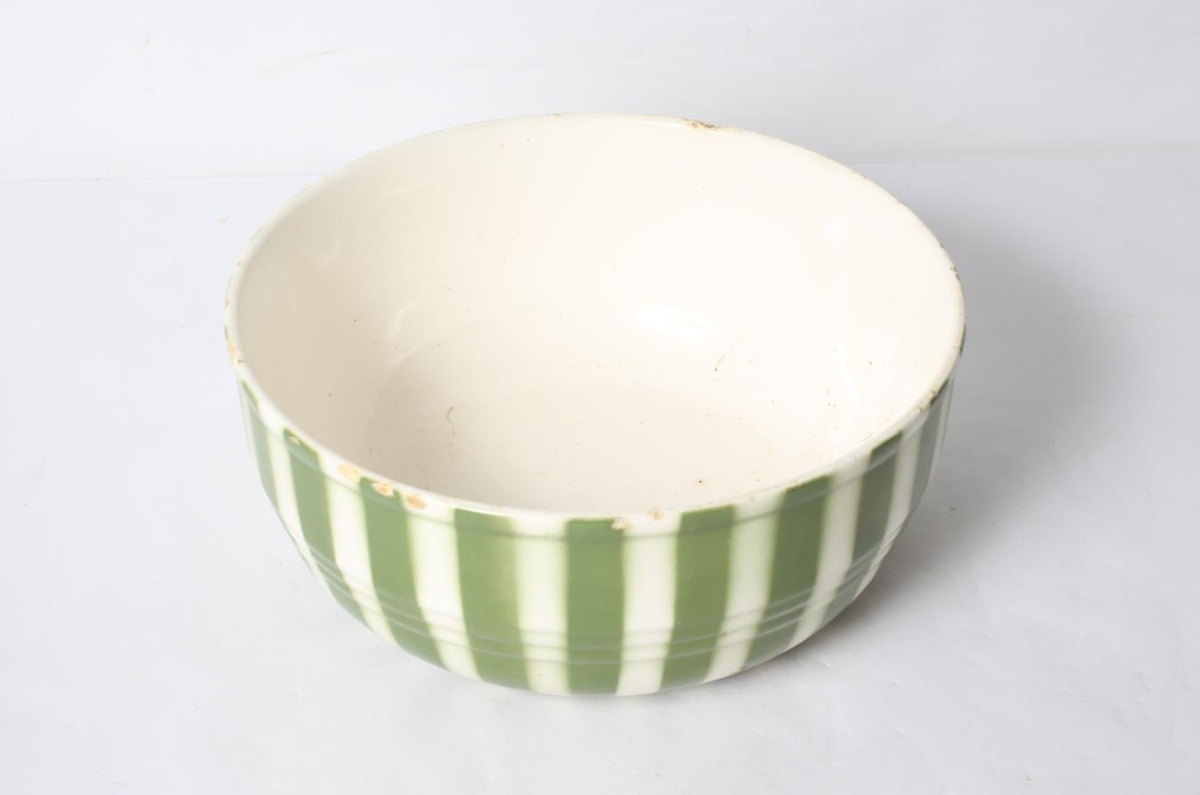 Röndótt skál, hvít og græn. Tékknesk. Alveg eins og MA-1997-107. Úr dánarbúi Jónasar Péturssonar Lagarfelli, Fellabæ.