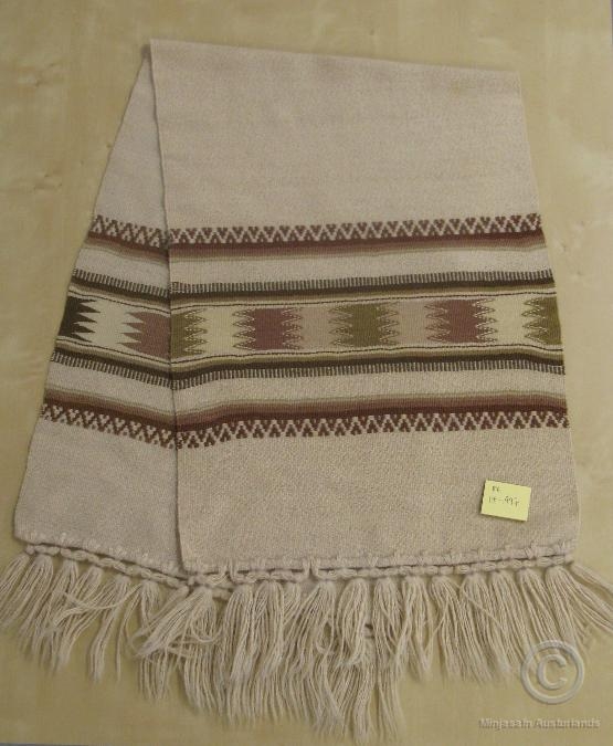 Ofinn, drapplitaður ullardúkur með brúnum og grænum munstursborða við sitt hvorn endann. Úr dánarbúi Jónasar Péturssonar, Lagarfelli 8 í Fellabæ.