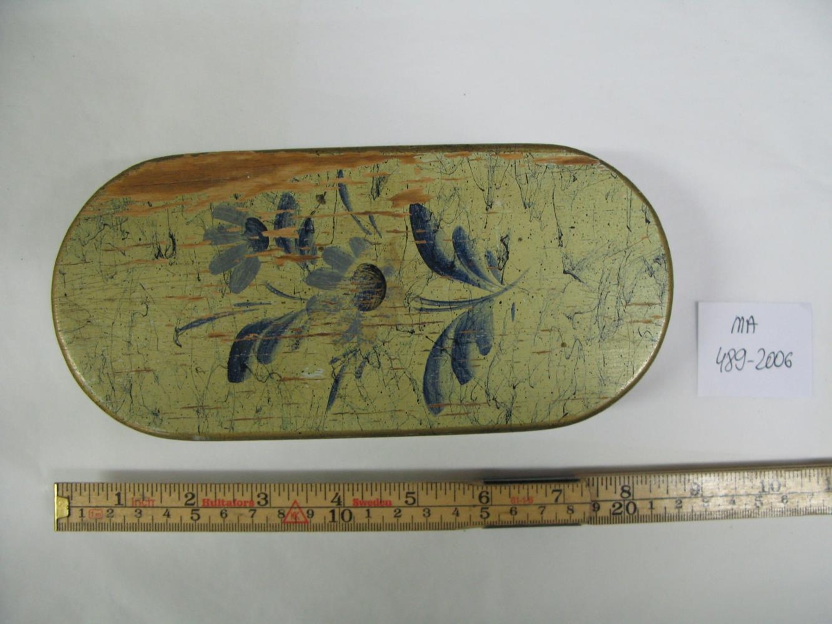 Sporöskjulöguð askja með loki. Græn máluð með bláum rósum ofan á lokinu. Kemur frá Flúðum í Hróarstungu.
