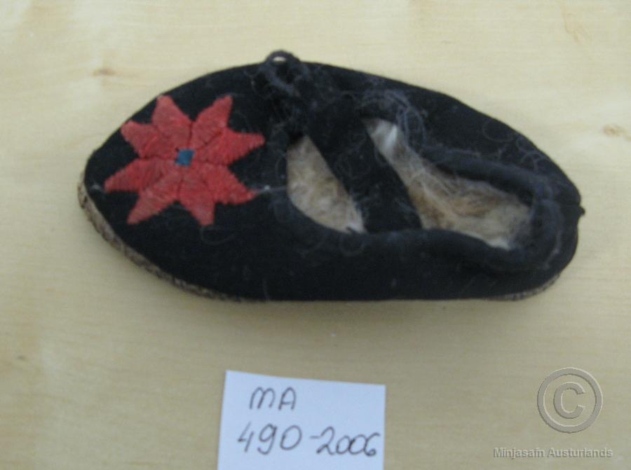 Eitt stykki barnaskór, handgerður. Skinn í sóla, lambsgæra innan í og svart tau utan um. Áttablaða rauð rós saumuð ofan á ristina. Skórinn er með ristabandi með kappmellaðri hneppslu. Tölu vantar.