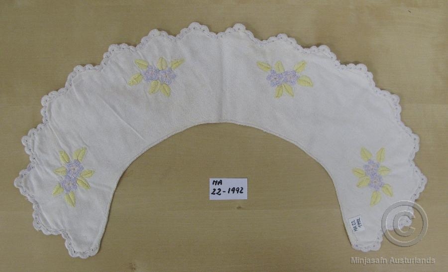 Hvítur léreftskragi, útsaumaður með bómullargarni. Úr eigu Bjargar Jónsdóttur (f. 1896), Grófargerði.