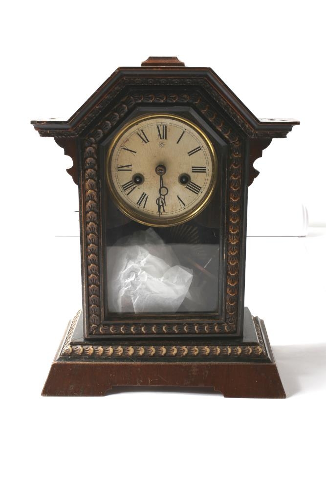 Fremur lítil, brún klukka. Útflúruð með rómverskum tölum, í laginu eins og hús með einni burst. Úr búi Guttorms Pálssonar, skógarvarðar á Hallormsstað (f.12.07.1884 d.05.06.1964). Sigfús Sigfússon á Skjögrastöðum gaf Sigríði Guttormsdóttur, fyrri konu Guttorms Pálssonar.