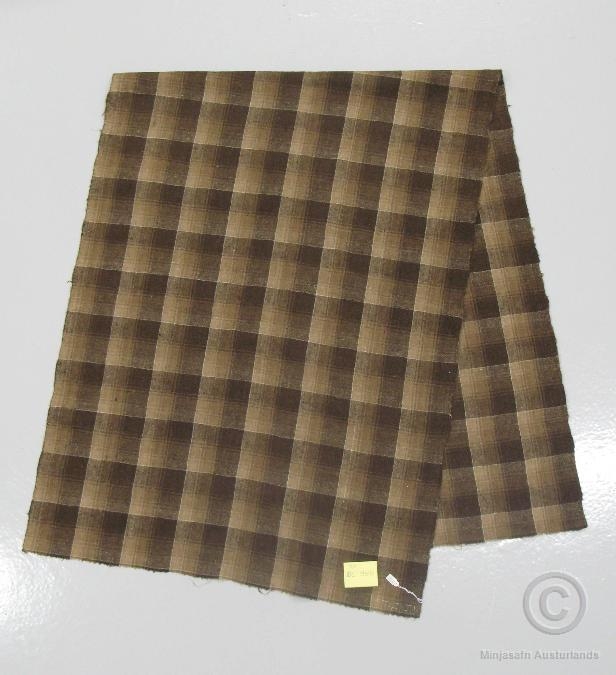 Köflóttur, brúnn, dúkur, spunnið í hann og ofið af Jónsbörnum, Höfðasystkinum.