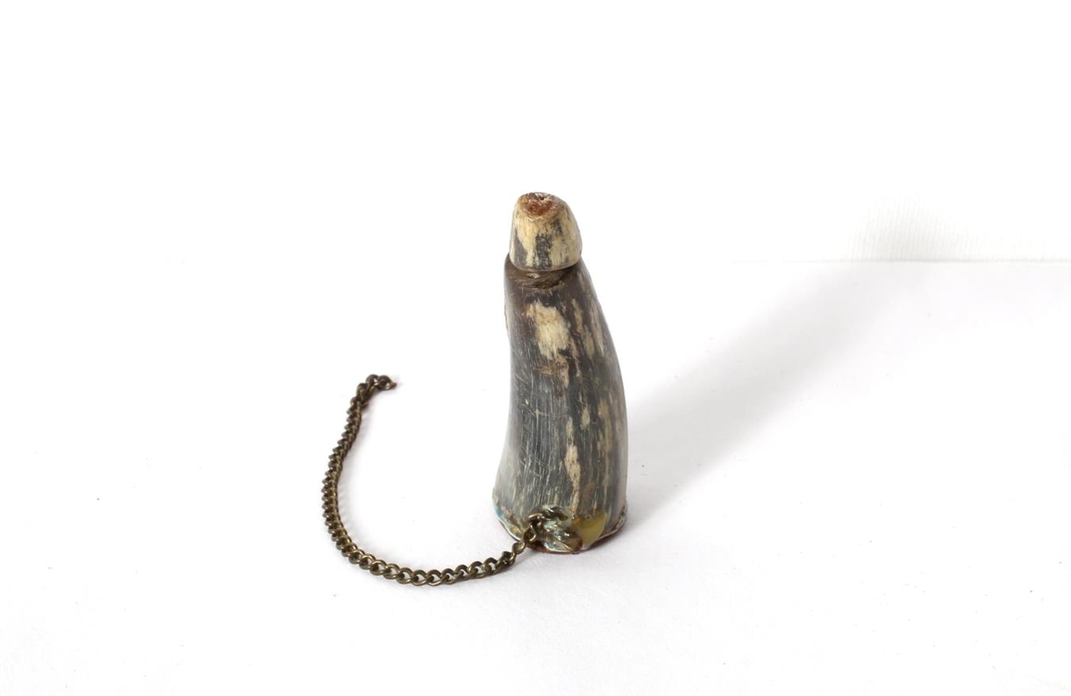 Pínulítil tóbaksponta með litlu loki. Keðja hefur verið föst milli neðsta hluta pontu og loks, en nú er hún aðeins föst neðst á pontunni. Úr dánarbúi Þorsteins Sigurðssonar, læknis.