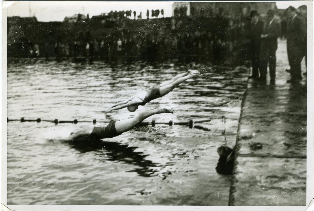Tvær sundkonur stinga sér til sunds. Sundkeppni í Nauthólsvík 1950-51. Á bakhlið er stimpill ljósm.: FILMPHOTO.