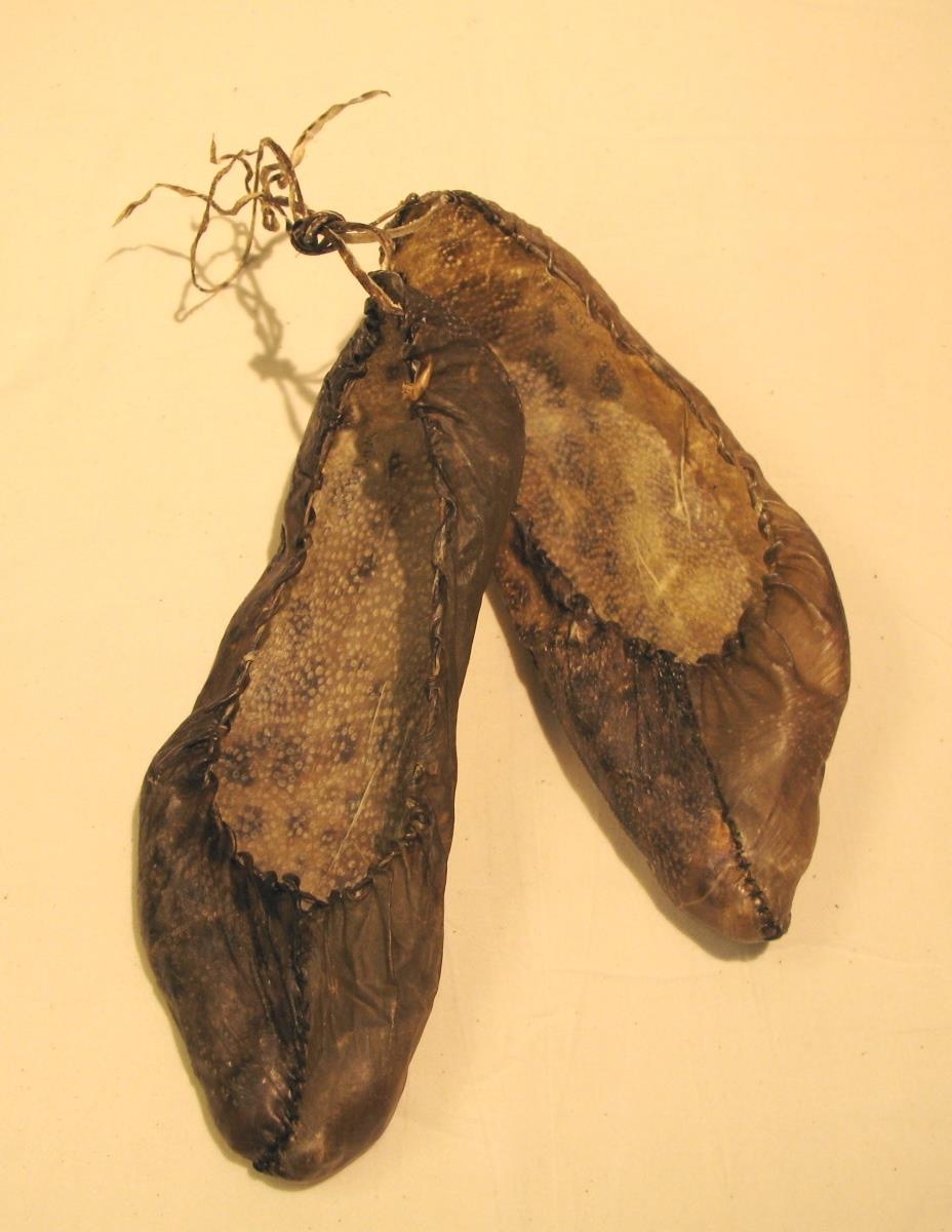 Roðskór úr hlýraroði. Skór með þvengjum. Skór af því tagi sem notaðir voru vestra og víðar við sjávarsíðuna. Ólafía Egilsdóttir frá Sjöundá í Rauðasandshreppi saumaði skóna gleraugnalaust, þá á níræðisaldri.