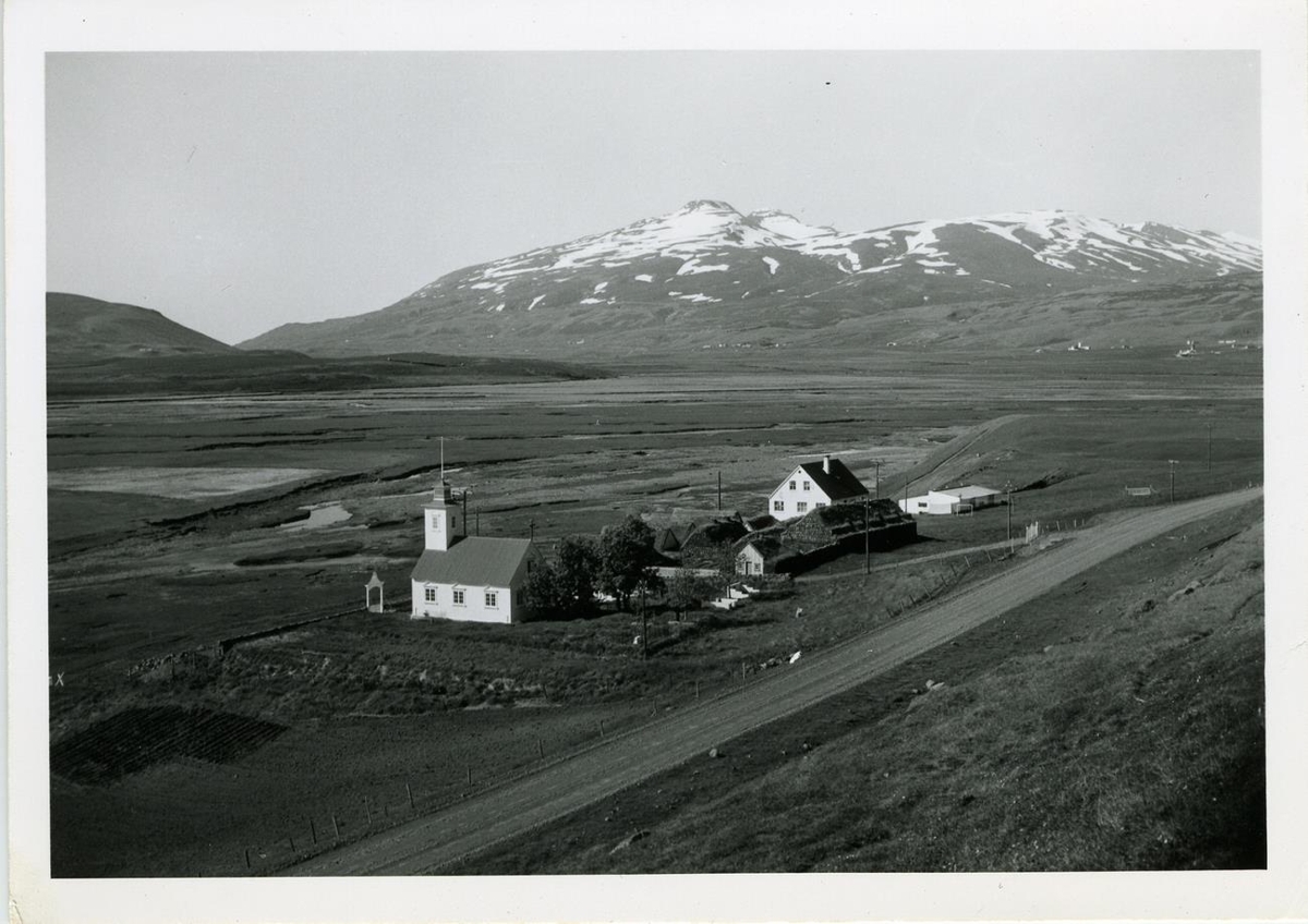 Horft yfir Laufás og láglendið framundan bænum. Kirkjan t.v., gamli bærinn og svo íbúðarhúsið fjær. Á bakhlið er skrifað: Laufás.