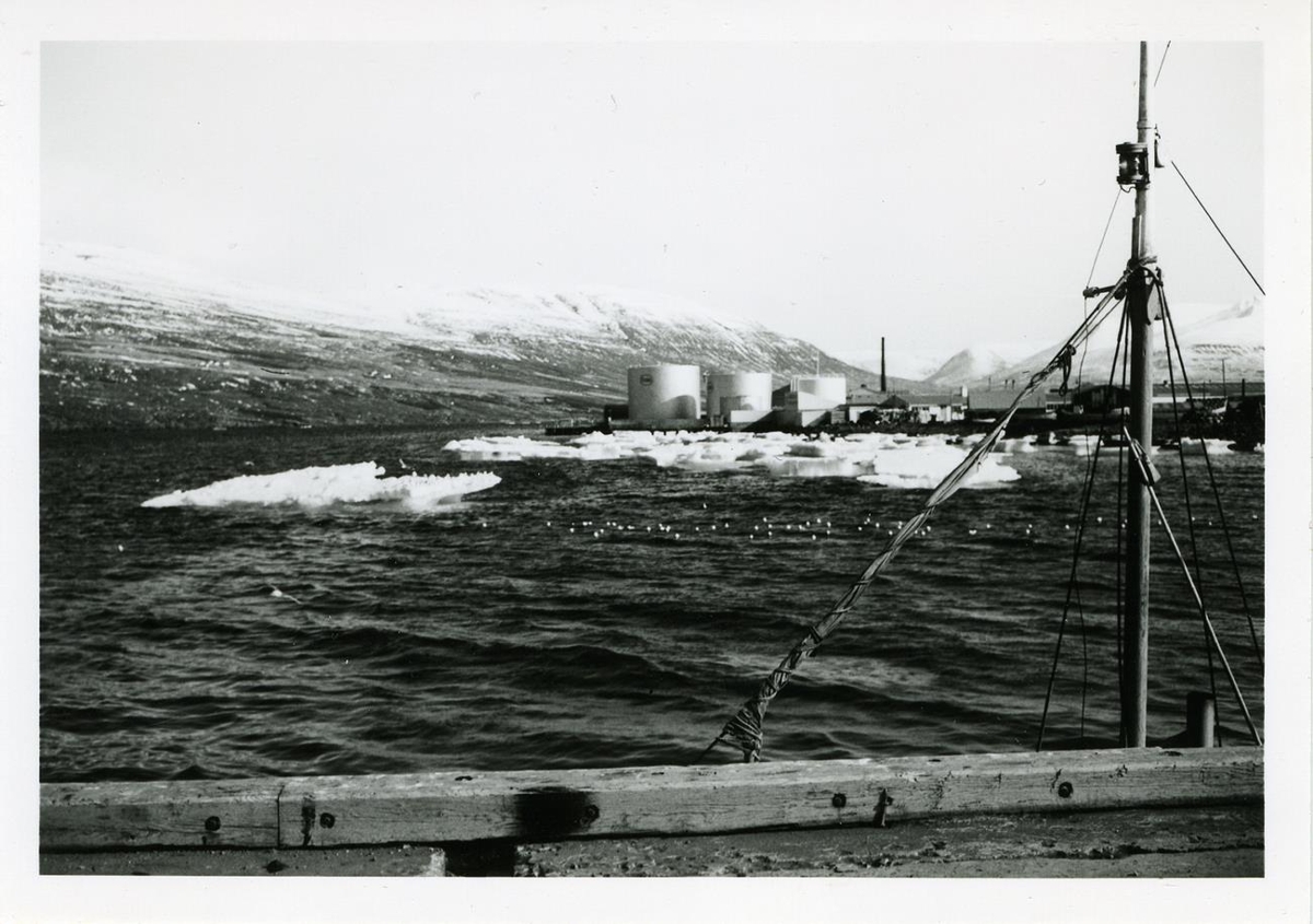 Bryggjukantur og siglutré báts í forgrunni, hafís á sjónum og olíutankar Essó á Gleráreyrum í baksýn.