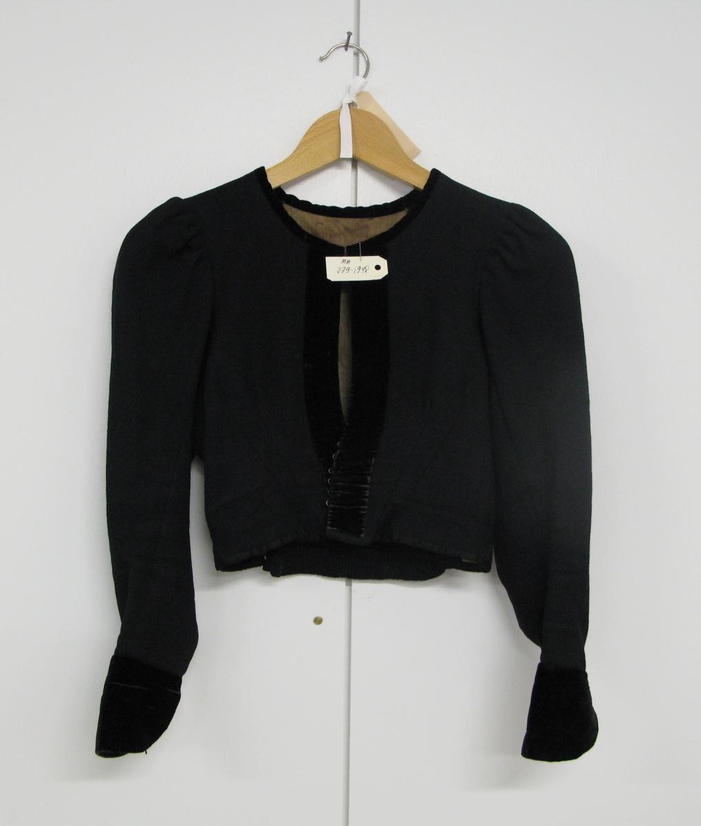 Úr svörtu ullarefni með flaueli niður að framan og framan á ermum. Hefur verið skreytt fremst í hægri ermi.