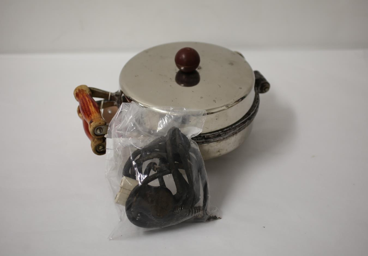 Kringlótt vöfflujárn fyrir rafmagn. Rauðar tréhöldur. Mynstrið er fimm hjartalaga bitar. Snúran sem tengir það v/ rafmagn er mjög morkin og molnar niður ef hún er hreyfð. Framleiðandi AKON WURTT - LGA.