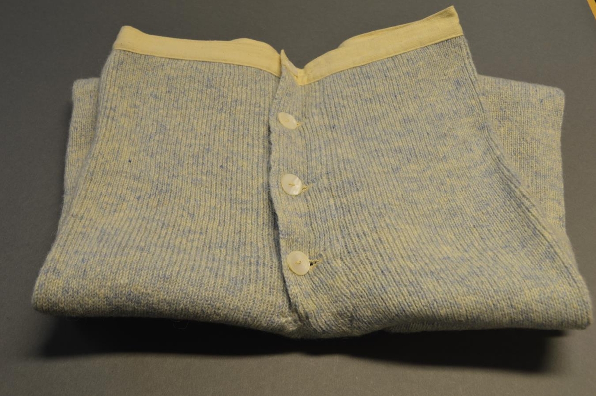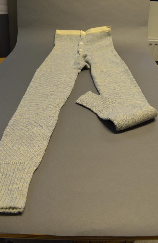 Nærbuxur karlmanns, blágráar að lit, ull, vélprjón. Gerðar handa Ingólfi Einarssyni árið 1959 af Halldóru Magnúsdóttur frá Snjallsteinshöfða í Landsveit, f. 29. nóv., d. 28. apríl 1970, fóstra Ingólfs. Ingólfur var eiginmaður Maríu [Eggertsdóttur gefanda], d. 2012. Þetta er vandað og gott verk.