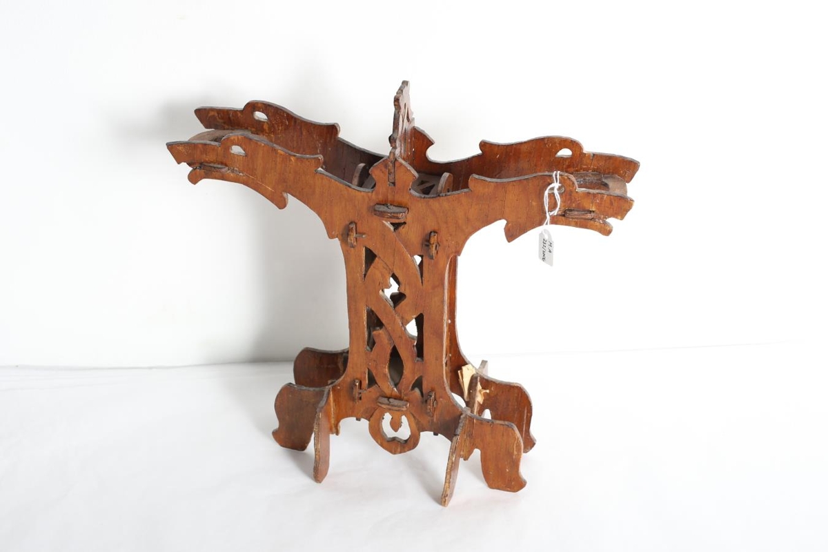 Útskorinn kertastjaki með drekahöfðum sem halda kertahöldunum. Framleiðandi: Pálína Waage. Aldur. 1937 til 1945. Kom frá Pálínu Waage, Seyðisfirði.