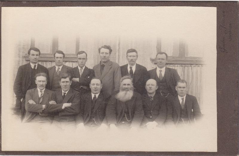 Efri röð frá vinstri. Óþekktur, óþekktur, Sigtryggur Jónsson á Hrappsstöðum, Björn Jóhannsson í Arney, óþekktur og óþekktur.