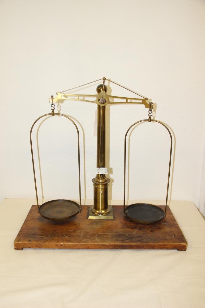 Lyfjavogin er stílhreinn og fallegur gripur. Jafnarma vogarás úr kopar á koparsúlu sem stendur á tréplötu. Tvær vogarskálar úr kopar.