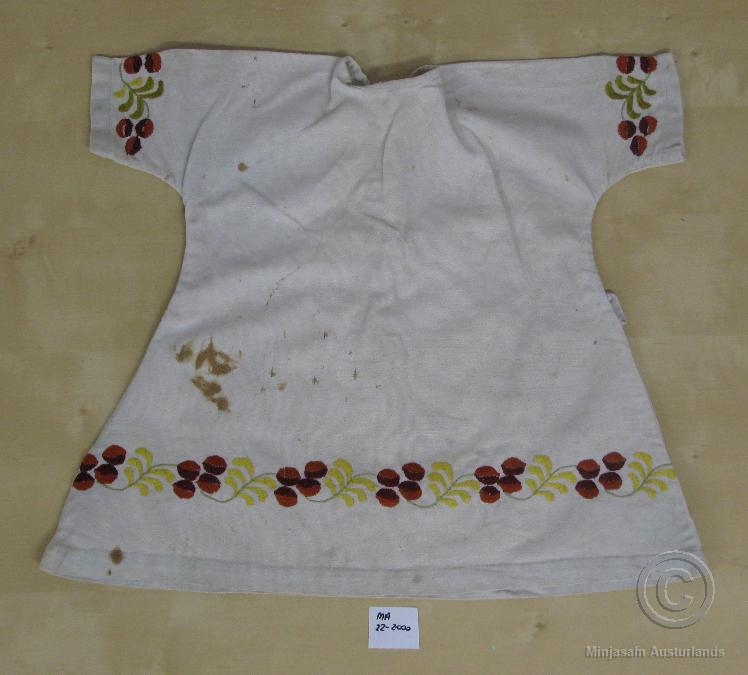 Telpnakjóll, laufa- og berjabekkur saumaður út á ermar og bol. Kjóllinn er út lérefti sem einhvern tíma var ljósblátt en er nú hvítleitt. Brúnir blettir spilla útliti. Útsaumsmunstur virðist hafa haldið lit. Kjóllinn er kominn úr dánarbúi Jóhanns Klausen, Hólsvegi 11, Eskifirði. Gefandi er eftirlifandi seinni eiginkona hans, Sigurbjörg Sigurbjörnsdóttir. Fyrri kona hans var Auðbjörg Jakobsdóttir.