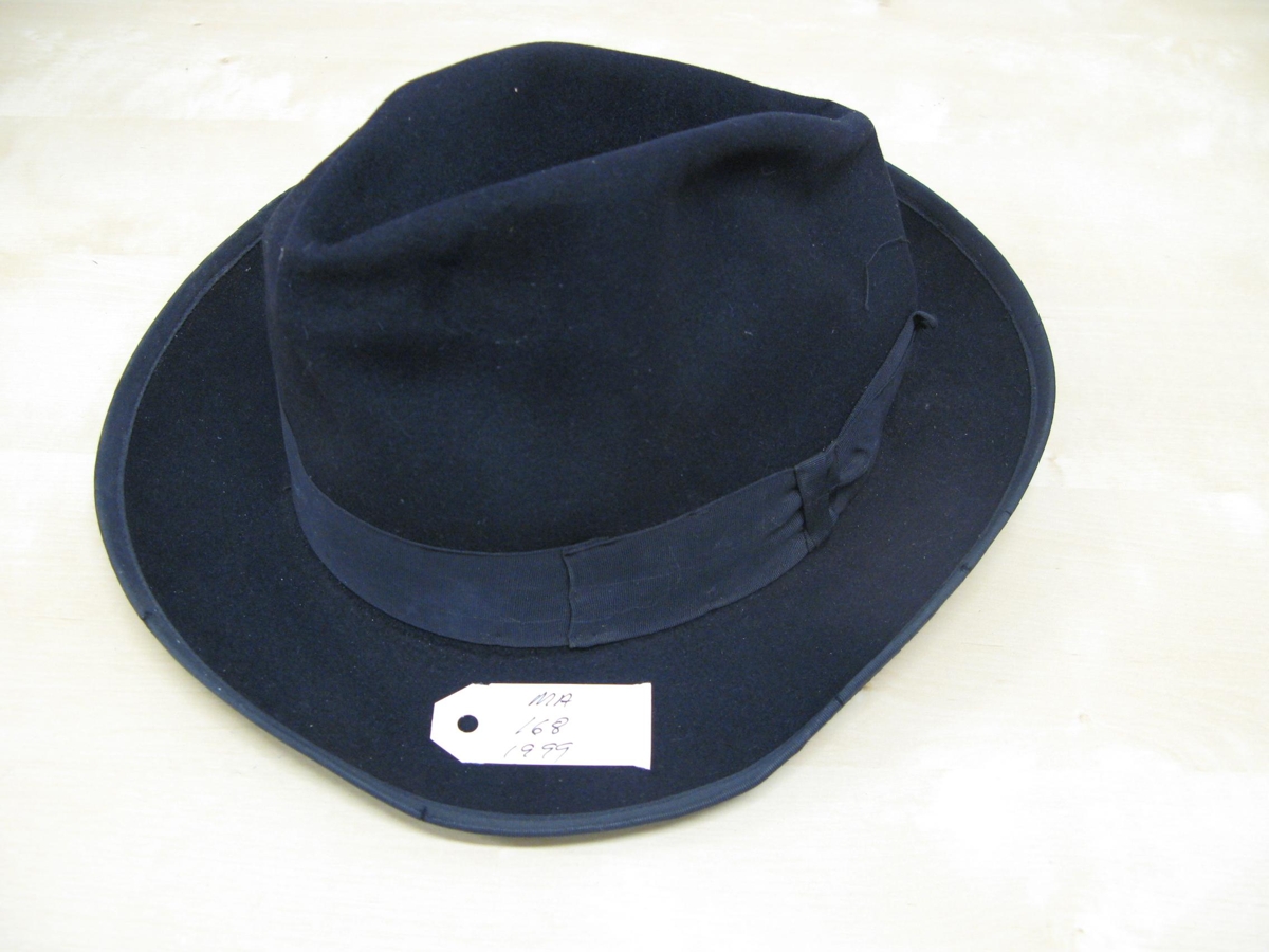 Svartur hattur með börðum og slaufu frá Hyde Park Hats. Úr dánarbúi Jakobs Þórðarsonar frá Fossi í Vopnafirði.