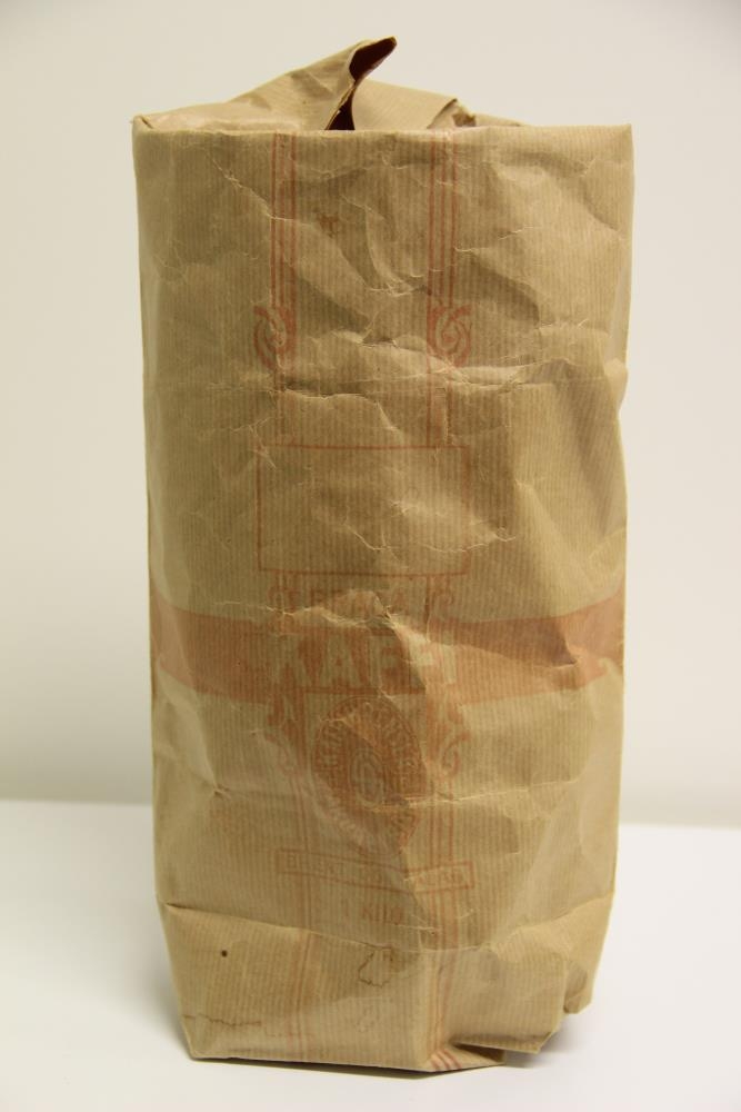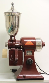 Hluturinn er brúnmáluð kvörn með stálmóttakara.