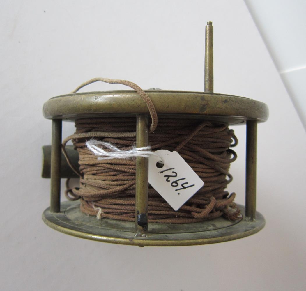 Veiðihjól úr kopar, 10 cm í þvermál, á því er brún flugulína. Hluta handfangs vantar. Á hjólið er grafið Cha. Farlow VC (?) Makers, 191 Strand, London. (All brass with ivory crank knobs 1852)