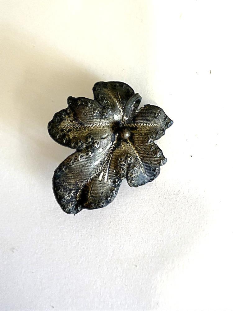 Lítil silfurnæla, gerð sem laufblað. Stærð 3x2,8 cm.