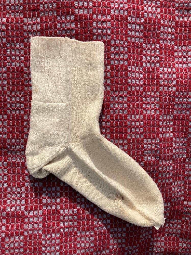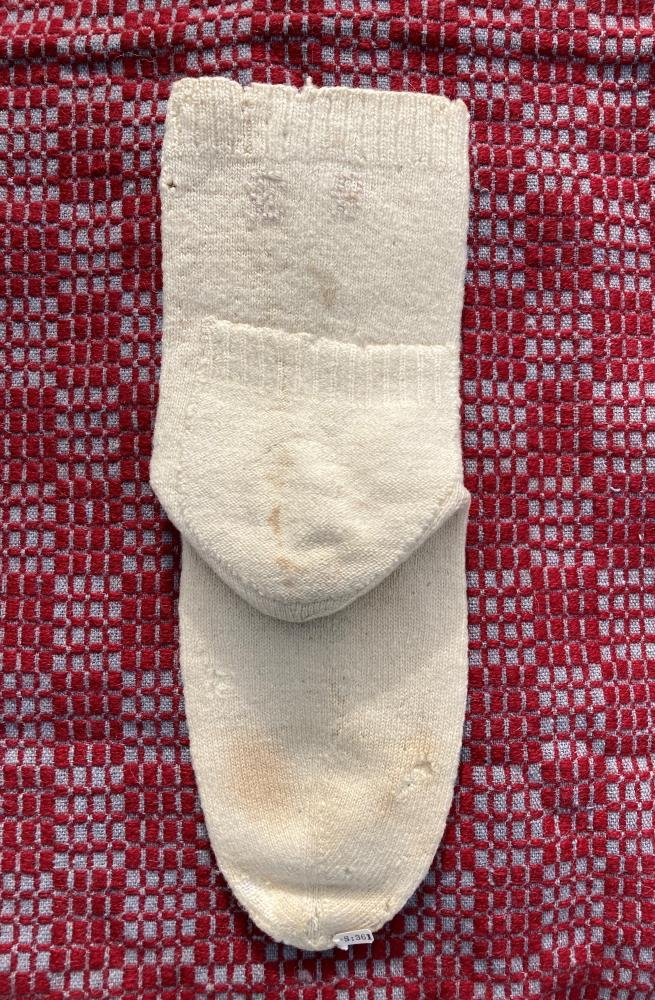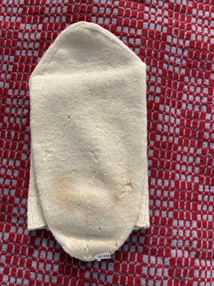 Hvítur háleistur, tættur á hæl, merktur E.B. Úr eign Einars Brandssonar frá Reynishjáleigu, sem átti hann 1886 við brottför frá Íslandi. Sýnir háleist samskonar og karlmenn báru innan undir sokkum um 1880.