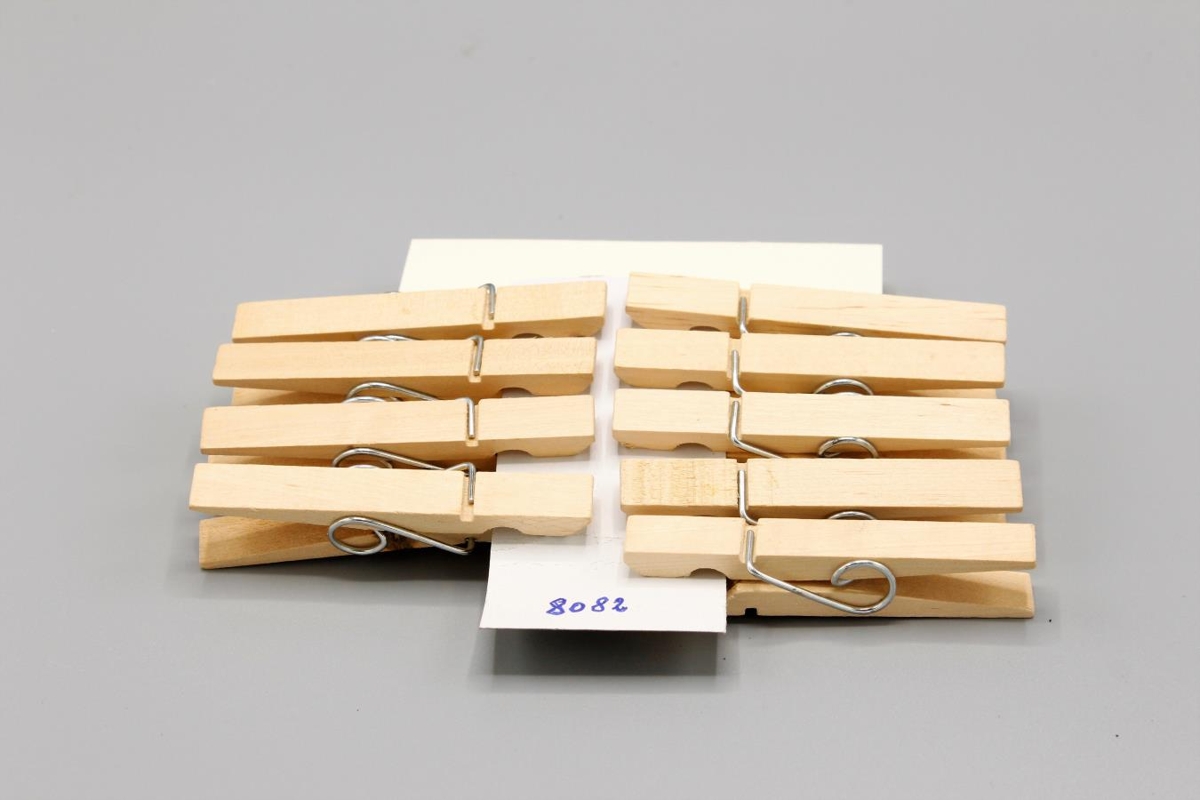 Eitt „sett“ af þvottaklemmum, 9 klemmur. Þetta eru innfluttar tréklemmur með járnfestingum. Í dag sjást aðeins innfluttar plastklemmur.