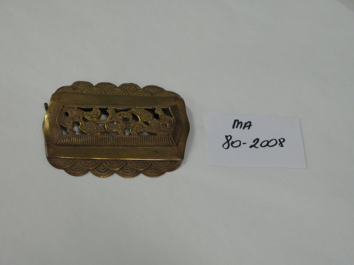 Beltissylgja aflöng úr messing. Gegnum skorið munstur í miðju og hálfhringir á langhliðum. Annar hankinn er laus. Ólafía fann þetta á eyðibýlinu