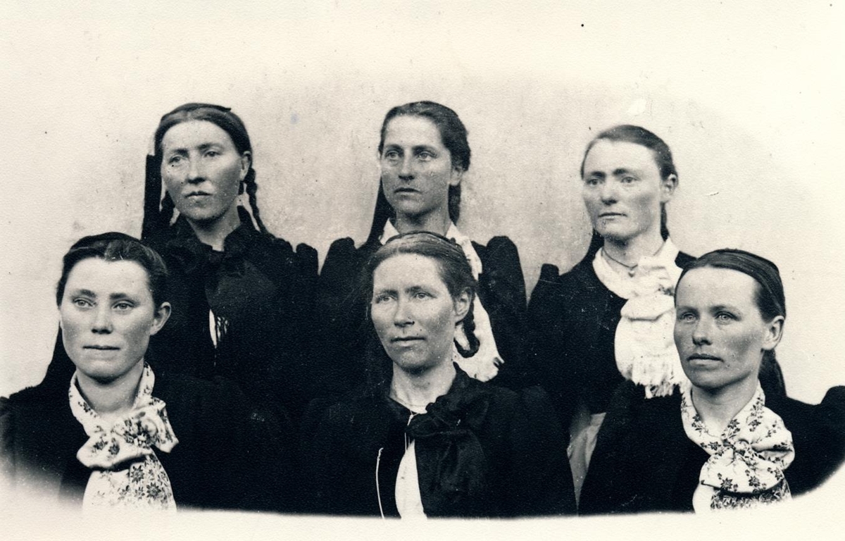 Ranghildur Gunnlaugsdóttir í Norður-Vík í Mýrdal ásamt vinnukonum. Fremri röð: Guðrún Bjarnadóttir, Ragnhildur Gunnlaugsdóttir og Kristín Bjarnadóttir. Aftari röð: Hólmfríður Jónsdóttir, Þorbjörgu Þorláksdóttir og Bergþóra Sveinsdóttir.
