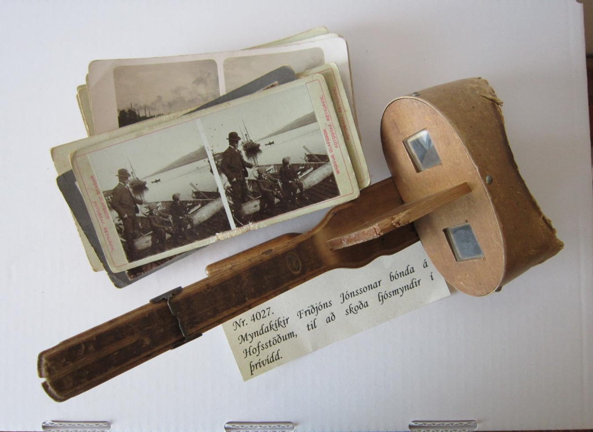 4027 4028 Myndsjá, áhald til að skoða myndir í þrívídd, því fylgja 19 sérstakar myndir, 15 íslenskar , merktar Magnús Ólafsson fotograf, Reykjavík og 4 þýskar frá 1906. Myndsjáin er úr við, pappa og járni með renndu handfangi. Í hana er þrykkt sporöskjulagað merki með stöfunum GB N. Úr eigu Friðjóns Jónssonar bónda Hofstöðum, Álftaneshr. Gefandi er sonur hans Jón Friðjónsson, 9/12 1997.