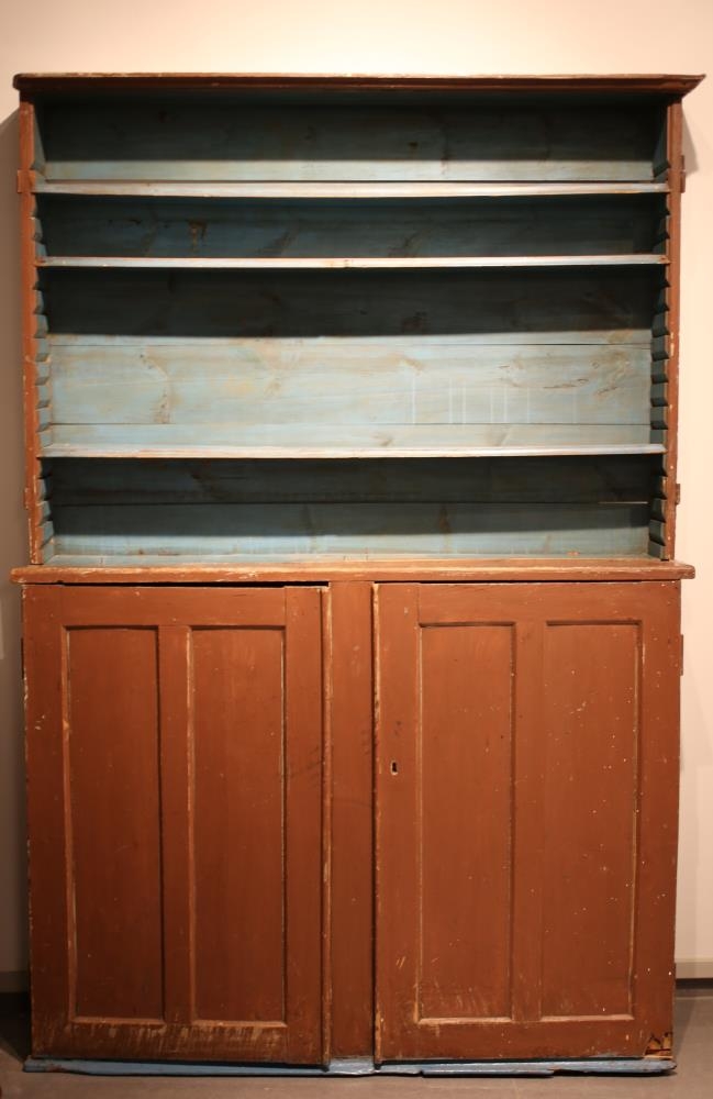 Brúnn og grænn. Samsettur úr tveimur hlutum. Skápar neðst og hilla fyrir ofan, hefir verið með hurðum en þær fylgja ekki. Úr búi Guttorms Pálssonar, skógarvarðar á Hallormsstað (f.12.07.1884 d.05.06.1964).